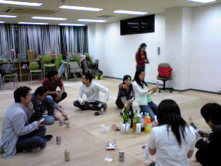 最終稽古を終え、荷物を搬出し終わるとだれからともなく、昨日の残りのビールを飲みだし、そこかしこでなんとなくまったり宴会モードに突入。