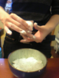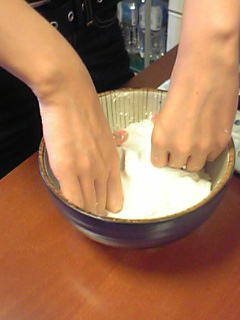 たまごとお粉と牛乳入れてぇ、あ、まぜるやつ(←度忘れ)ないからぁ、さいばしでまぜちゃえ。えいえい。