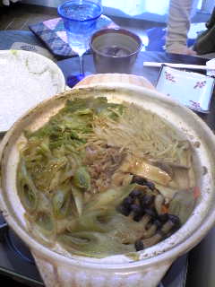 具は、キャベツ、みずな、にんじん、ねぎ、豆腐、エリンギ、しめじ、えのき、豚肉、マロニーちゃん☆