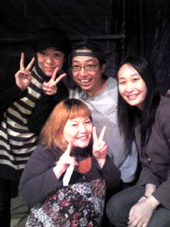 終演後のテントにて。上段左より:出演者の椿組のポンちゃん、リブレの橋本さん、一緒にみにいった青年座のあきちゃん。下段:みにきていた椿組のたかえちゃん。
