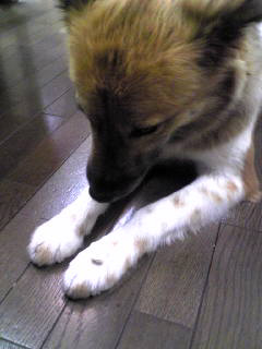 左手の上にえさを置かれ「待て」の指示に従うこはだ。